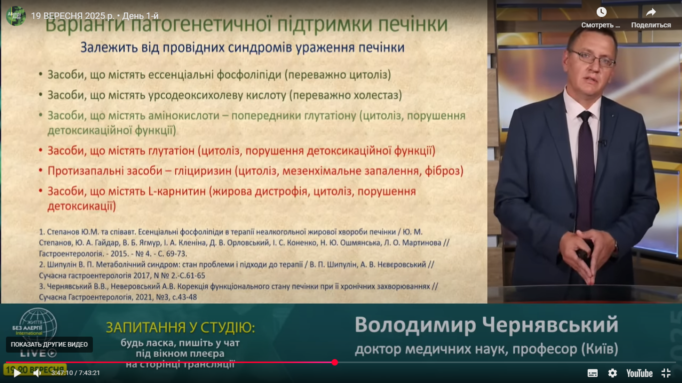 В завершені своєї доповіді Чернявський Вололодимир Володимирович приділив увагу протизапальному і антифібротичному впливу патогенетичного лікування, завдяки препарату ГЕПАРИЗИН (гліциризин) - засобу з доведеною антифібротичною та антиканцерогенною дією. Тривале лікування гліциризином у поєднанні з гліцином і цистеїном істотно знижує ризик виникнення цирозу печінки та гепатоцелюлярної карциноми.