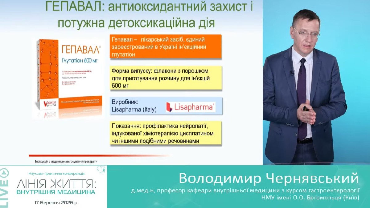 Окремий практичний акцент у доповіді було зроблено на Гепавал® — інʼєкційний препарат глутатіону.Професор Чернявський зазначив, що глутатіон є ключовим компонентом ендогенної антиоксидантної та детоксикаційної системи організму. Його застосування сприяє зменшенню оксидативного стресу;покращенню детоксикаційної функції печінки;зниженню біохімічних маркерів цитолітичного синдрому (АЛТ, АСТ).