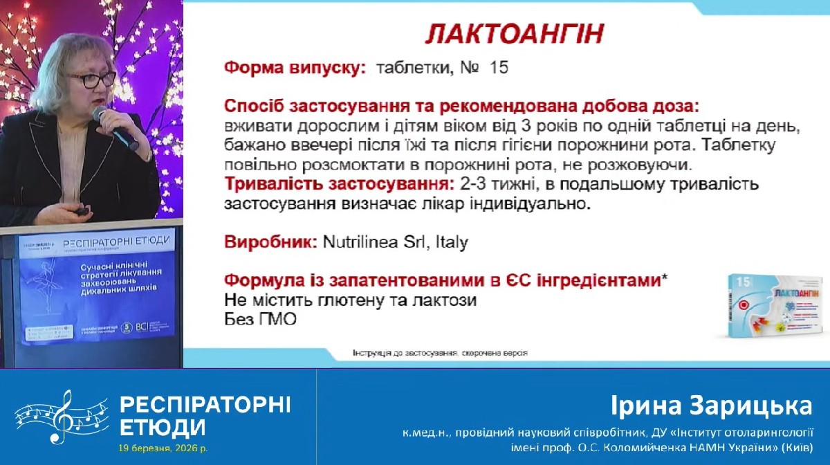 Не менш змістовною стала доповідь к.мед.н. Ірини Станіславівни Зарицької, присвячена можливостям фарингеального парапробіотика Lactobacillus helveticus MiMlh5. За науковими даними, цей штам може сприяти пригніченню патогенної мікрофлори, регуляції імунної відповіді та зниженню запалення слизової оболонки ротоглотки.