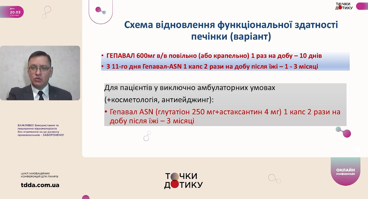 Окремий розділ доповіді було присвячено сучасним можливостям гепатотропної та антиоксидантної терапії, зокрема застосуванню Гепавал® та Гепавал® ASN у клінічній практиці дерматологів і гастроентерологів. Професор наголосив, що глутатіон є ключовим компонентом ендогенної системи детоксикації печінки, бере участь у нейтралізації вільних радикалів, зниженні оксидативного стресу та може сприяти зменшенню проявів цитолітичного і холестатичного синдромів.