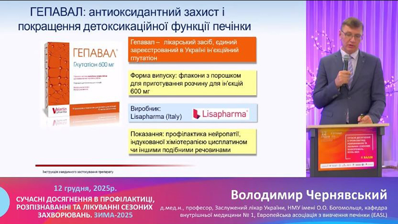 Окремий практичний акцент у доповіді було зроблено на Гепавалі® —інʼєкційному препараті глутатіону.Професор Чернявський зазначив, що глутатіон є ключовим компонентом ендогенної антиоксидантної та детоксикаційної системи організму. Його застосування сприяє зменшенню оксидативного стресу;покращенню детоксикаційної функції печінки;зниженню біохімічних маркерів цитолітичного синдрому (АЛТ, АСТ).